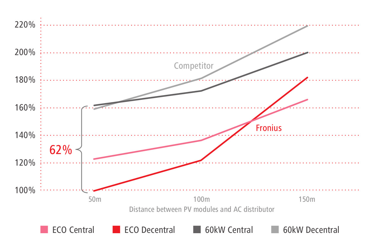 A más 60 kW-os inverterekkel való összehasonlítások – legyen szó akár centralizált, akár decentralizált rendszerről – azt mutatják, hogy a Fronius Eco 27 kW-os inverter költséghaszna 62%. Ezek a megtakarítások a kábelbevezetés, valamint az AC és a DC elosztásához szükséges alkatrészek tekintetében adódó különbségeknek köszönhetők. Az inverter és az AC elosztó között áthidalandó távolságok szintén jelentősek. A DC Connector Kit 35 csatlakozószett használatával a Fronius Eco 27 kW-os inverter centralizált rendszerekhez is használható.