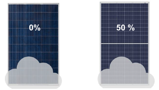 Ez például lényeges télen, amikor a leolvadó hó általában minden panelnél egységesen az alsó tartományt takarja vagy a korai és késői órákban általában a panelek felső része több fényt kap. Még fontos előny a vágott cellás paneleknél a fél cellában fele akkora áramerősség keletkezik mint a teljes cellában, de mivel kétszer annyi fél cellánk van ezért a napelem panelban ugyanannyi lesz az áramerősségünk, mint hagyományos társaiban. Ennek azonban az az előnye hogy a kisebb áramerősség miatt a cellák kevésbé melegszenek, így melegedés hatására kevésbé veszítenek hatásfokukból és a várható élettartamuk is hosszabb.